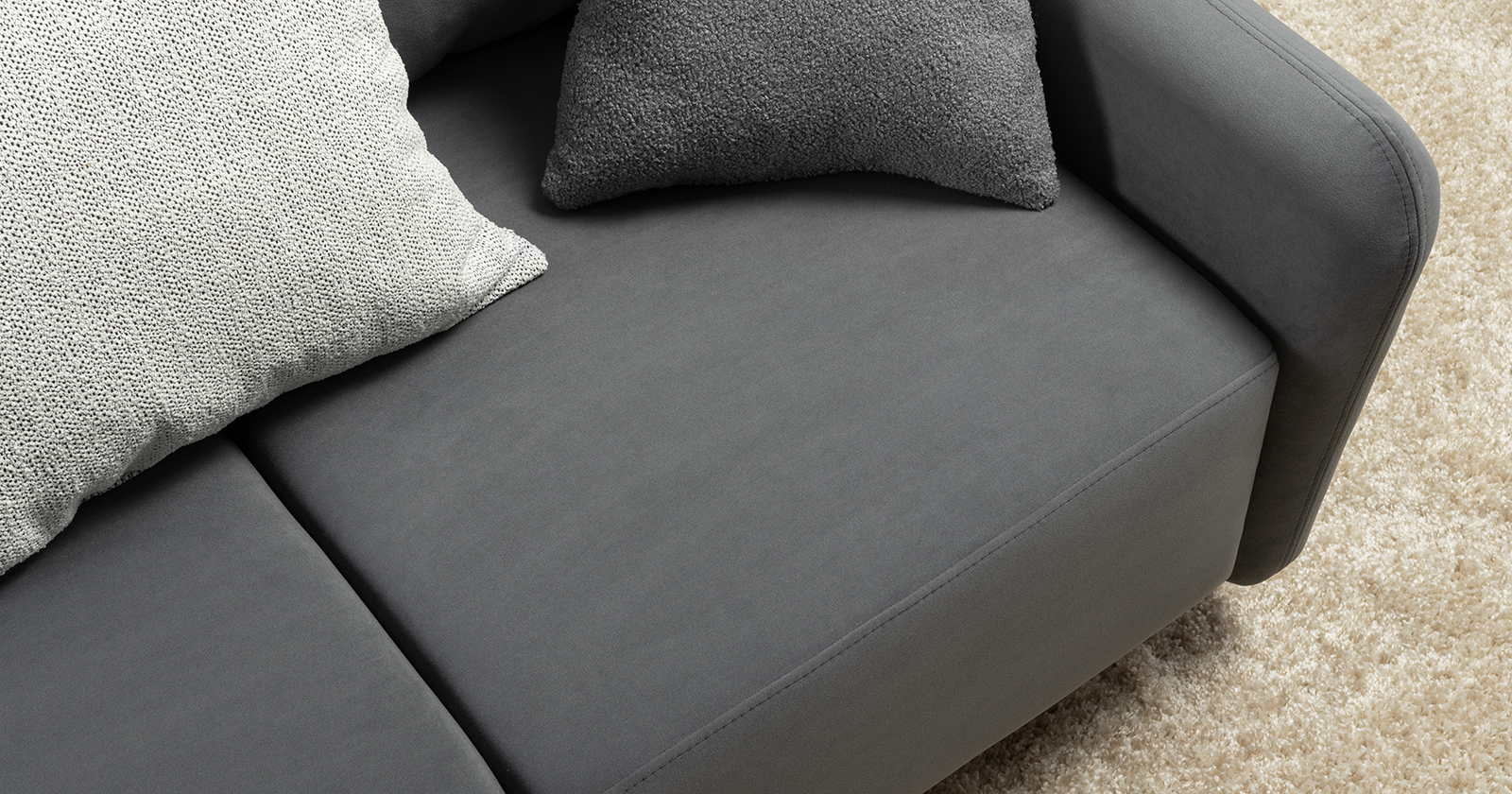 В комплекте 5 двусторонних приспинных подушки и 2 декоративные думки. Задняя спинка в ткани основы. Декоративные отделочные строчки по боковинам и сиденью