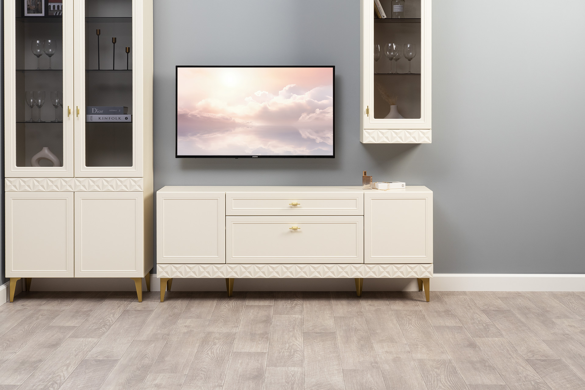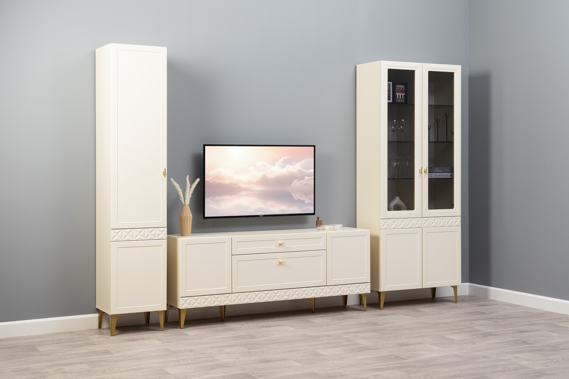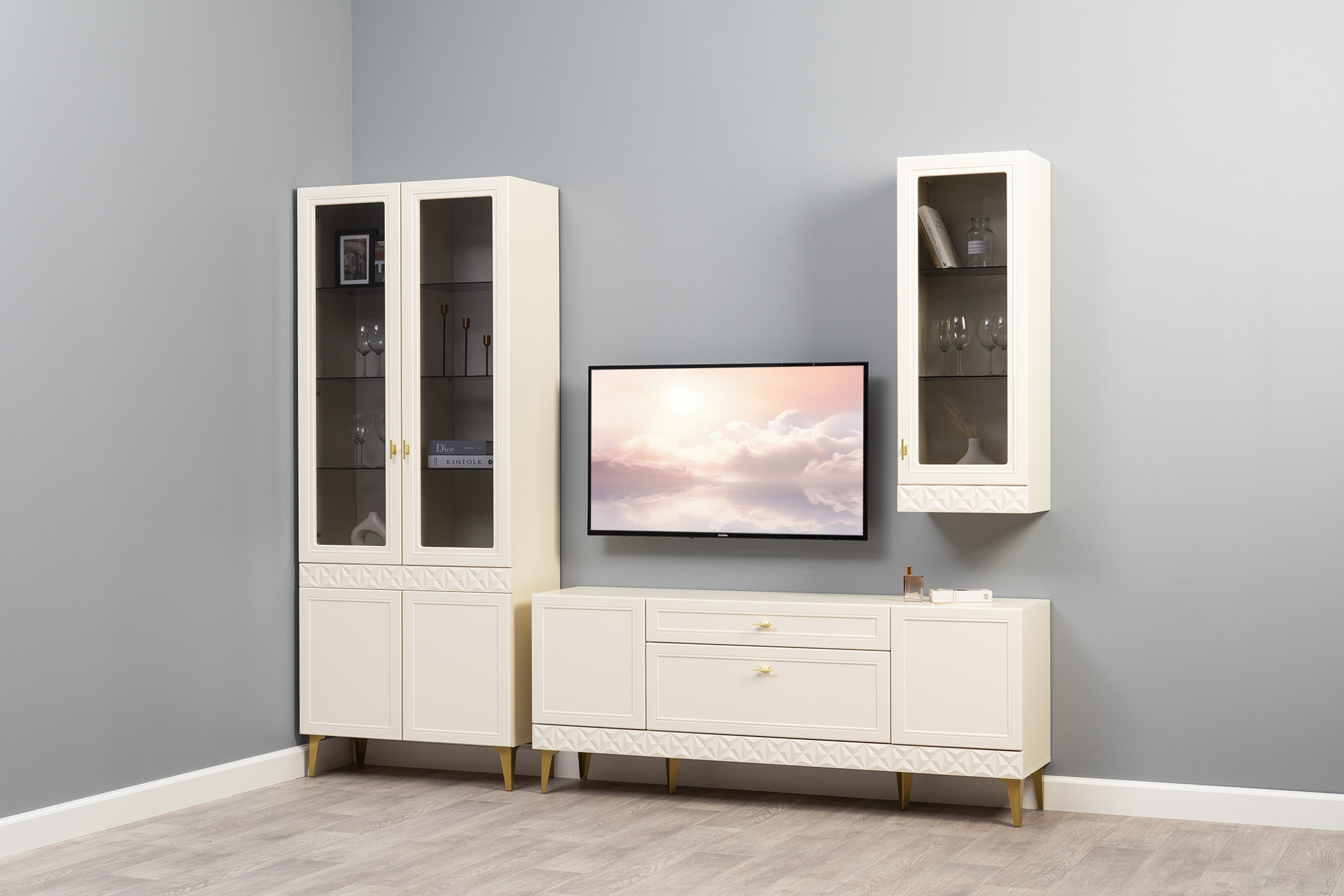 Гостиная Марион композиция 2 слоновая кость С341 PE, слоновая кость 6898 ПВХ, белый PE шагрень (собирается на любую сторону)