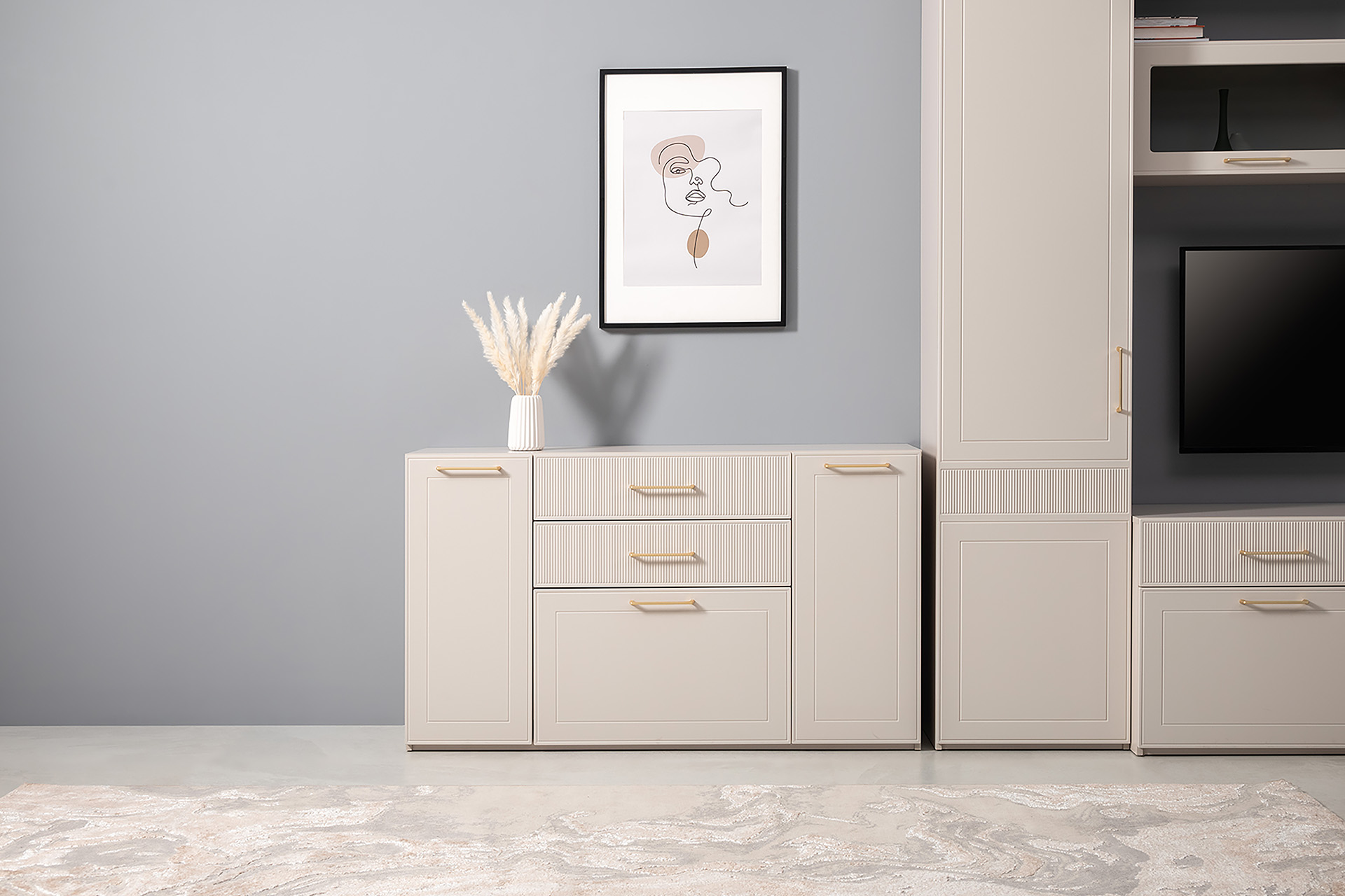 Гостиная Ричфорд композиция 2 без карнизов, кашемир 5981 BS, моно керамика D166-2 ПВХ, белый PE шагрень (собирается на любую сторону)