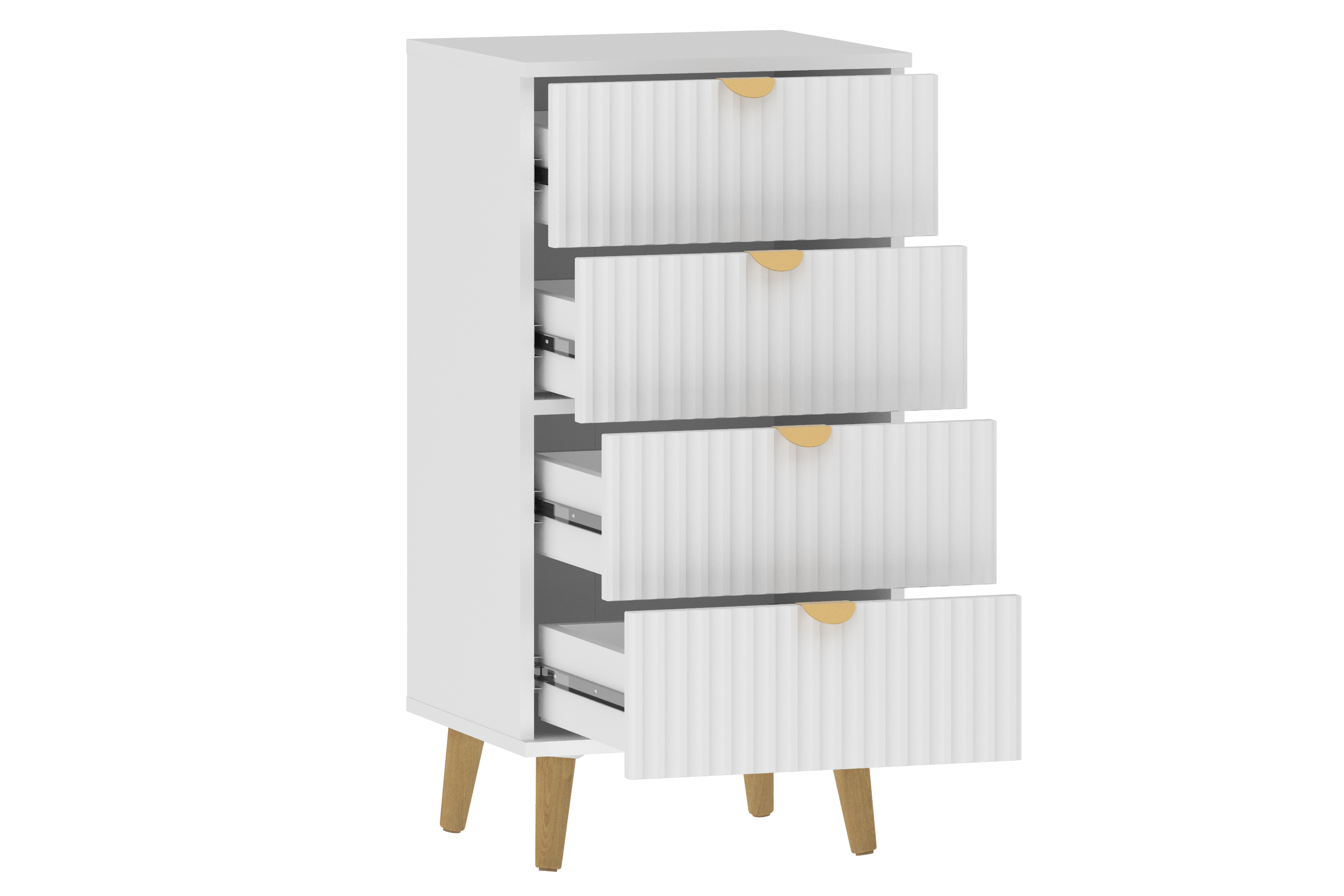 Комод оснащен четырьмя выдвижными ящиками, которые открываются плавно и бесшумно благодаря шариковым направляющим, а высокие опоры облегчают процесс уборки.