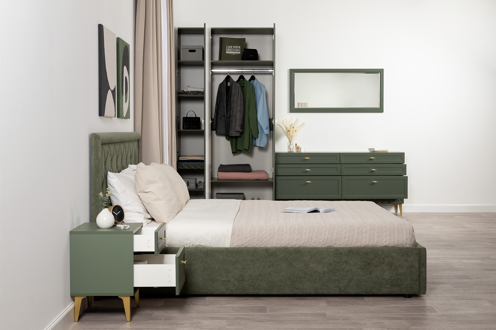 Изящные линии, глубокая фрезеровка фасадов из МДФ и благородные оттенки. Утончённая «Слоновая кость» и изысканная «Олива Шагрень» с глубоким зелёным тоном — создают атмосферу уюта, тепла и благородства. Металлические ручки и опоры золотого цвета придают мебели утончённый блеск, а петли и направляющие с доводчиками обеспечивают плавное и бесшумное закрытие фасадов.