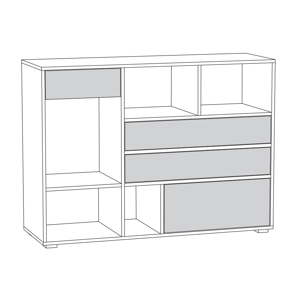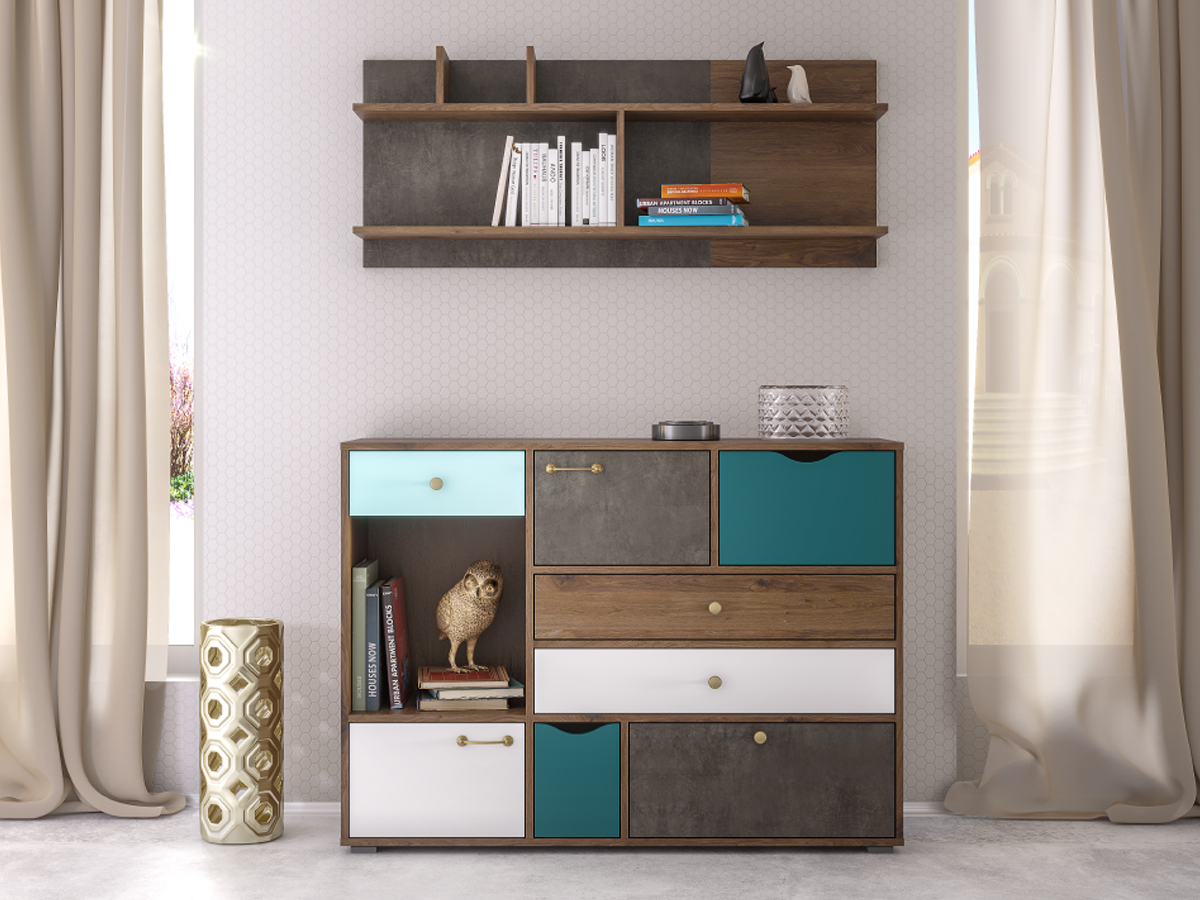 Набор мебели малых форм Вайс сочетает в себе нежные, тёплые цвета и строгие геометрические формы. Набор модулей позволяет собирать законченные композиции, например для гостиной. Акцент в интерьере можно поставить с новым комодом, имеющим разноцветные фасады.
