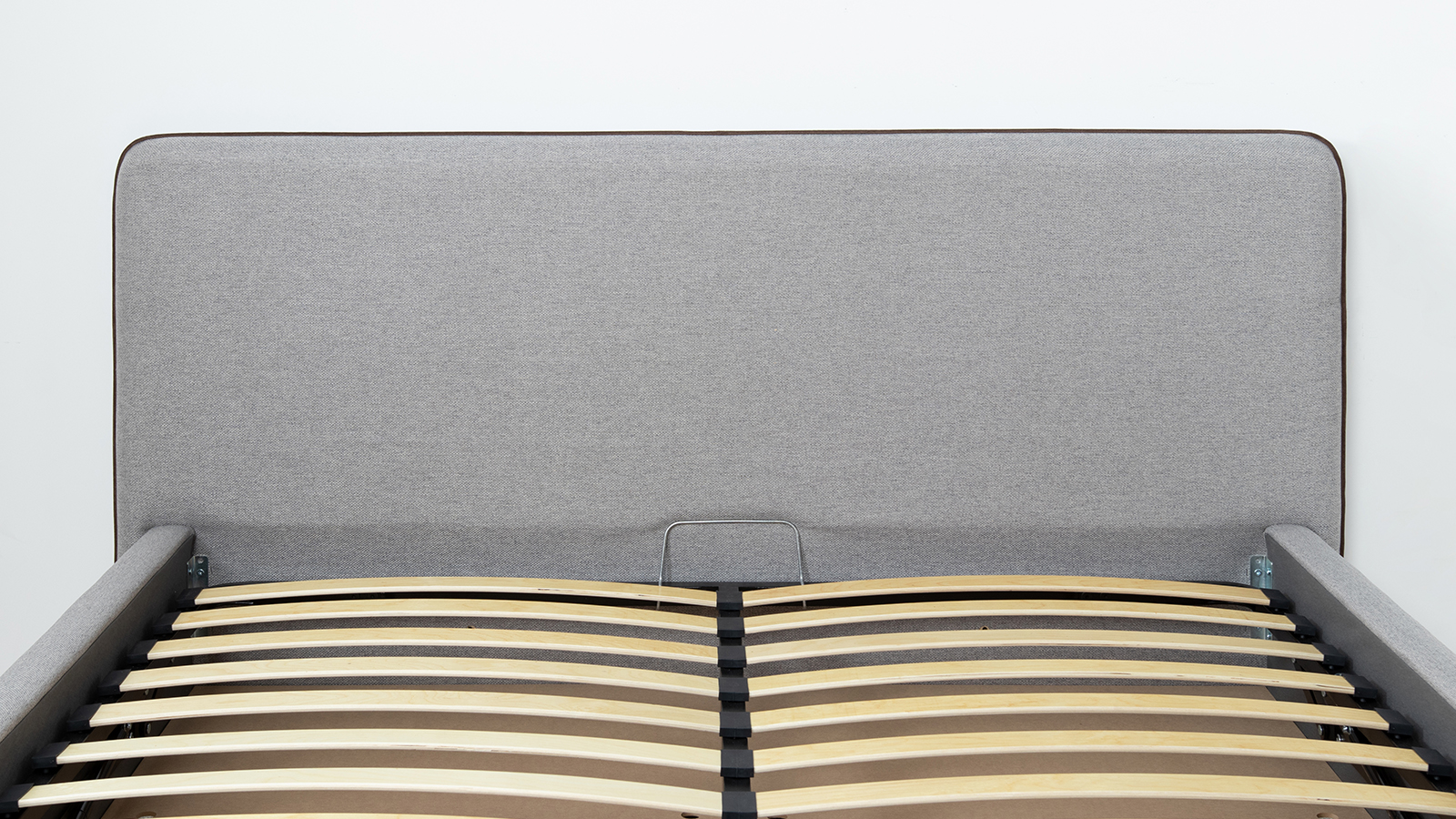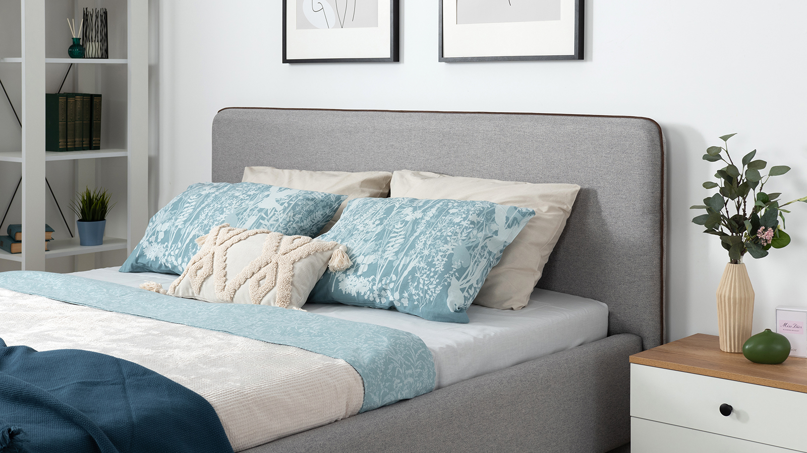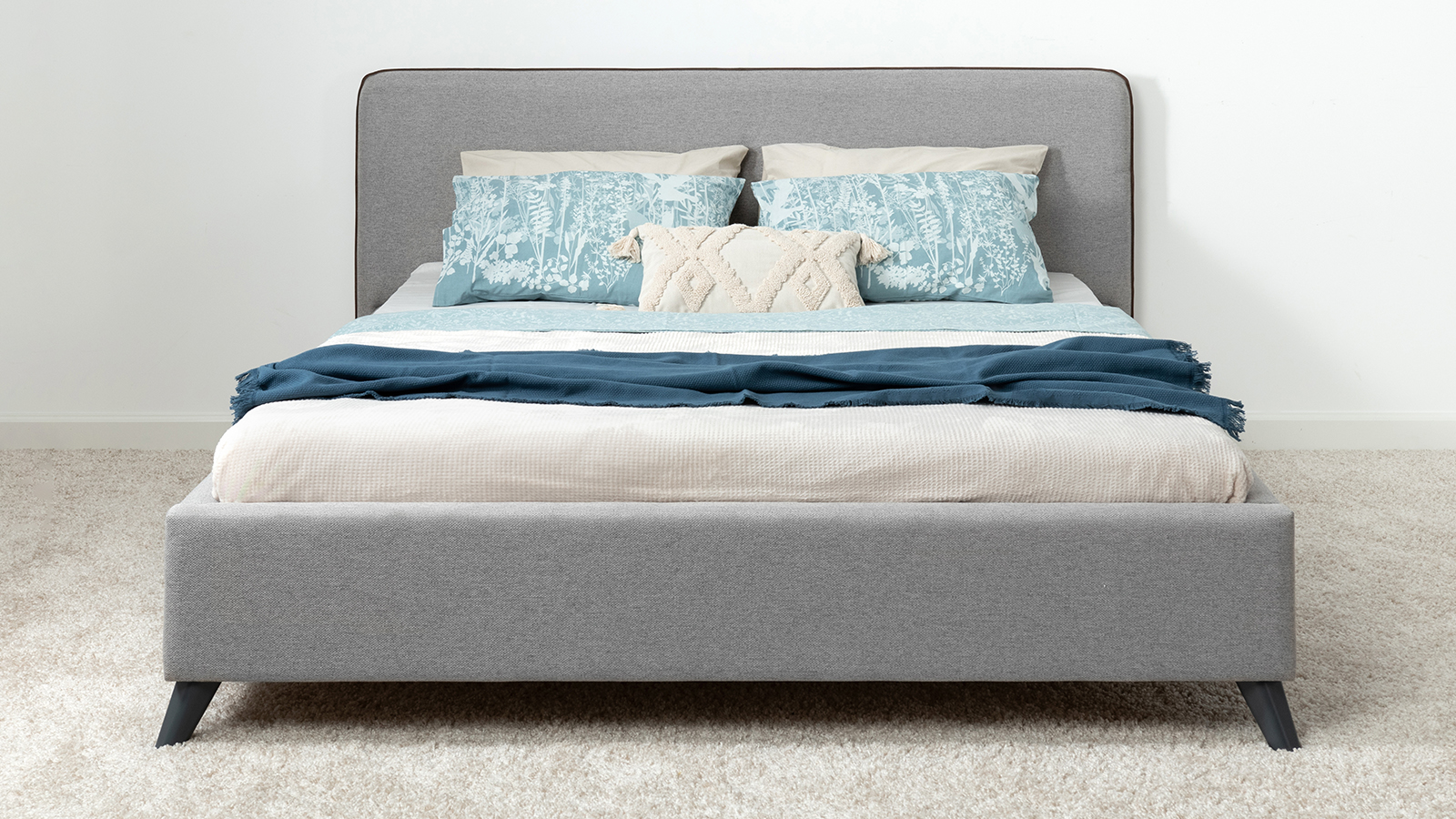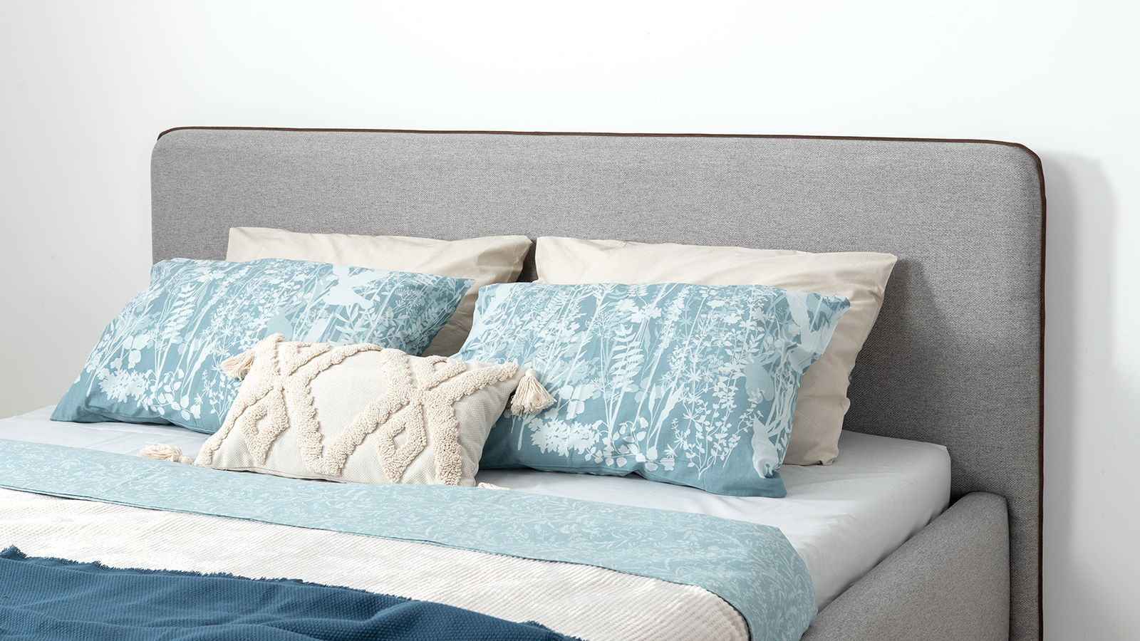 Cкругленный торец изголовья оформлен контрастным кантом.