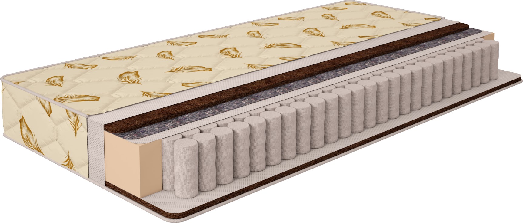 Кокосовая койра 1 см - спрессованные волокна кокосового ореха, пропитанные натуральным латексом. Материал обладает бактерицидными свойствами. Очень прочен и долговечен, а также придает матрасу жесткость.