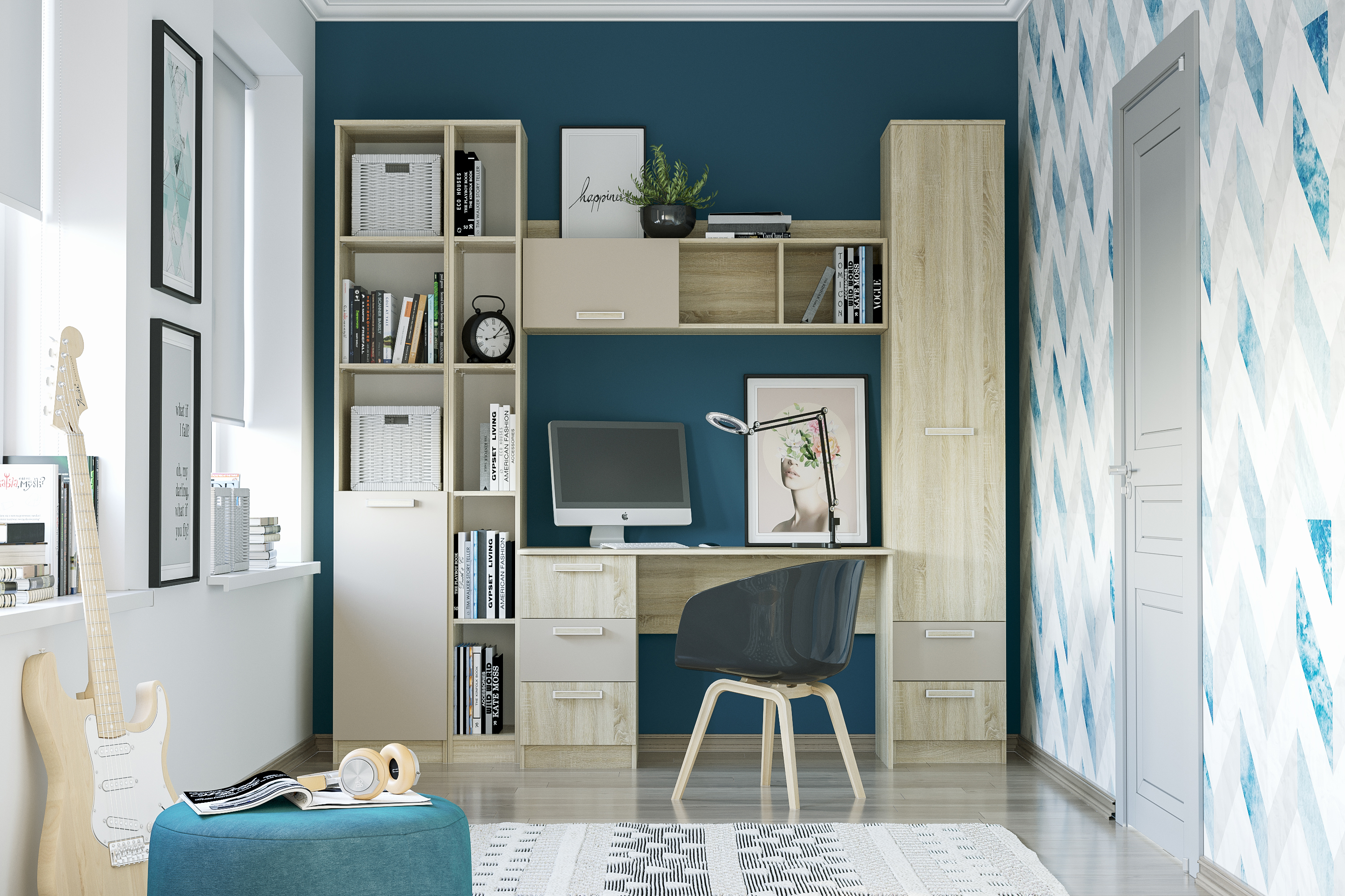Полка НМ 011.38-01 М1 органично дополнит рабочее место в детской. Закрытая секция модуля подойдет для хранения книг. Газлифты максимально высоко поднимают фасад вверх, обеспечивая большую площадь обзора содержимого. Предметы декора будут хорошо смотреться в открытых секциях полки.