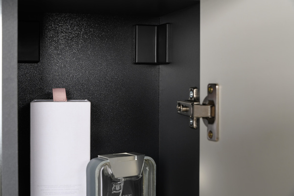 Минималистичные фасады в трендовом цвете без лицевой фурнитуры открываются за край либо нажатием (push-to-open).