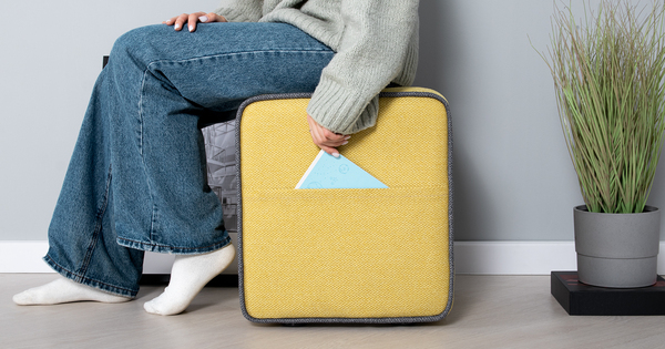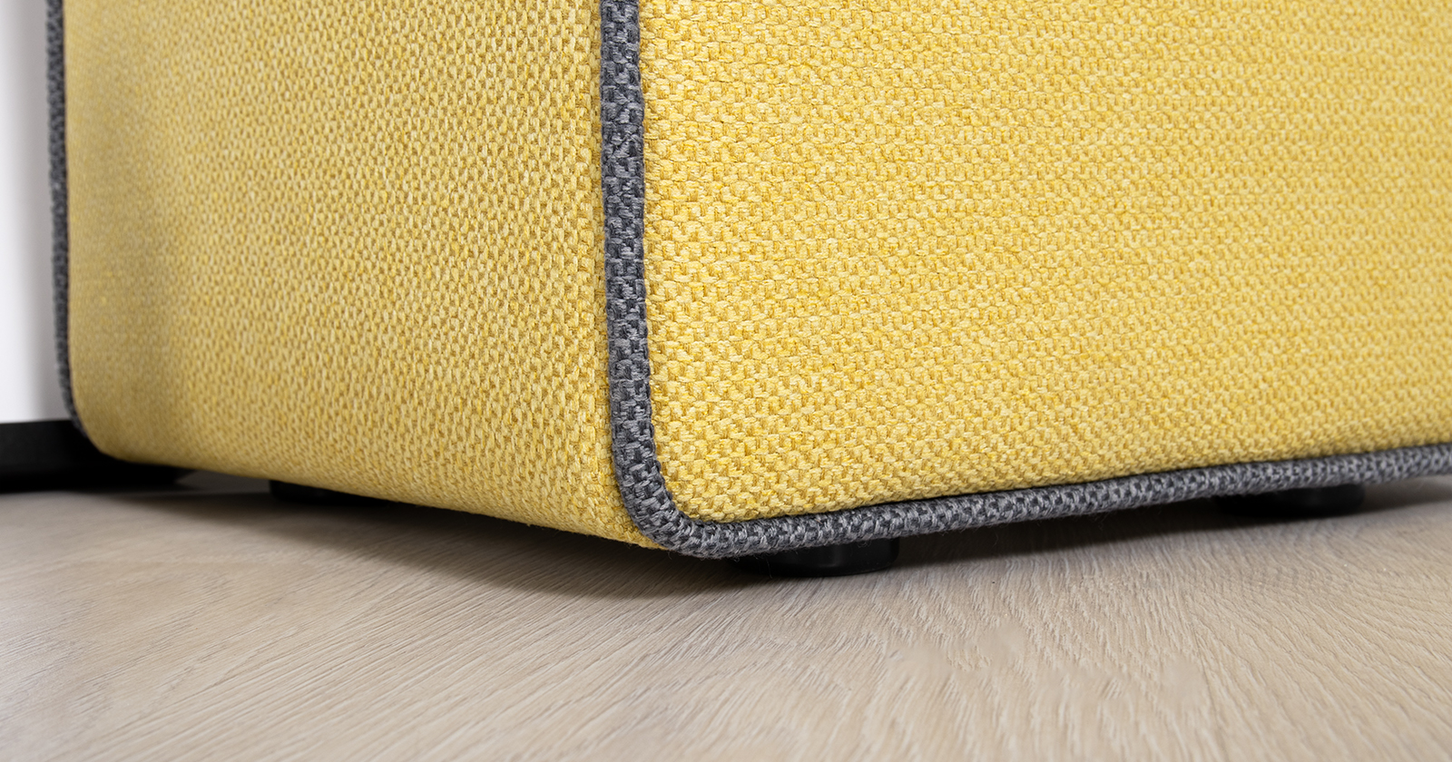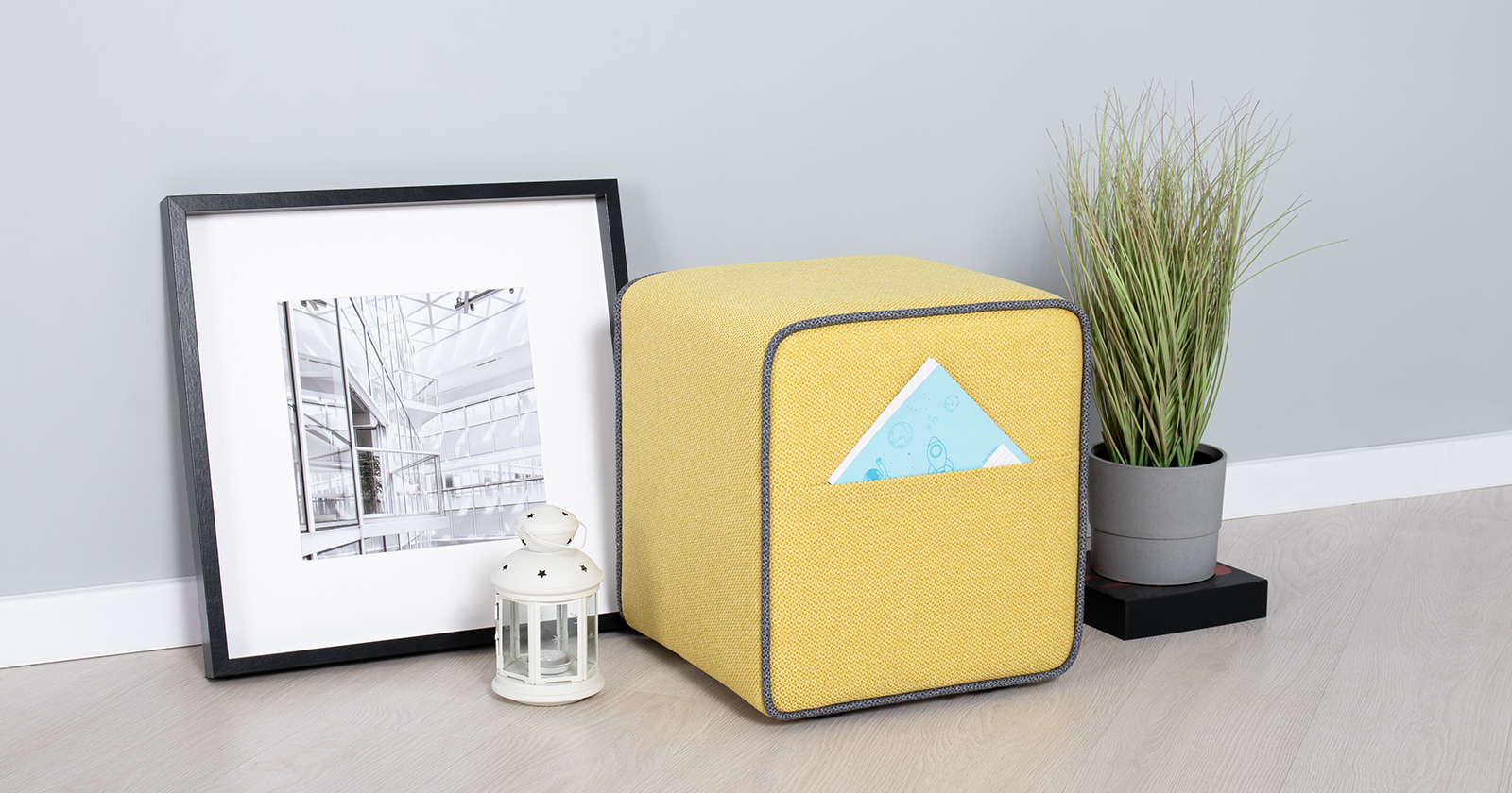 Боковые карманы на противоположных сторонах пуфа, два противоположных торца оформлены контрастным кантом