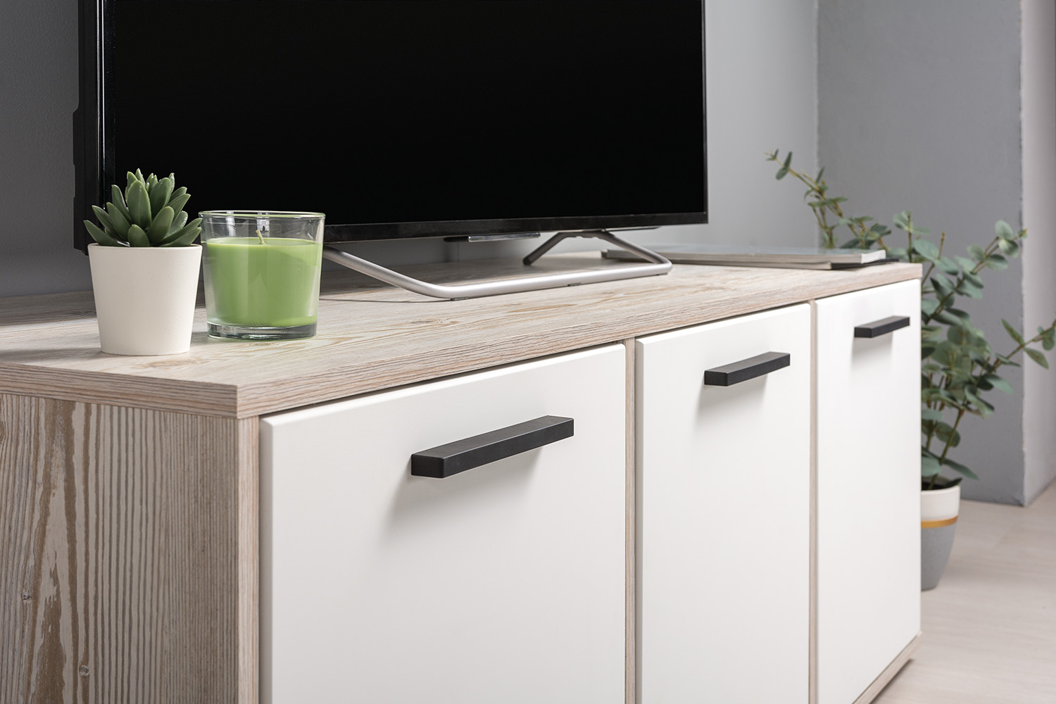 Тумба под ТВ в гостиную Петра 13.281 белый PE шагрень, милк софт ПВХ, бетон чикаго беж ПВХ
