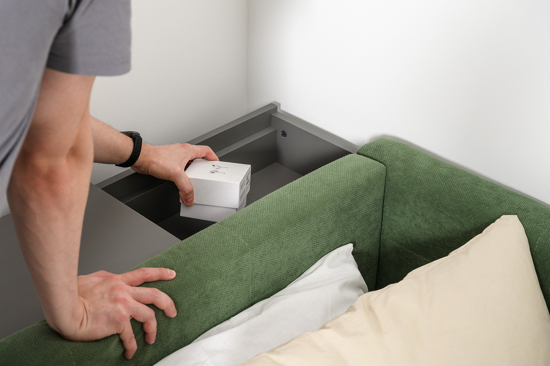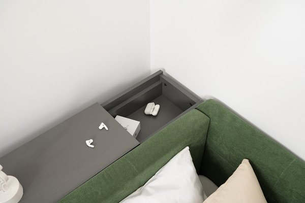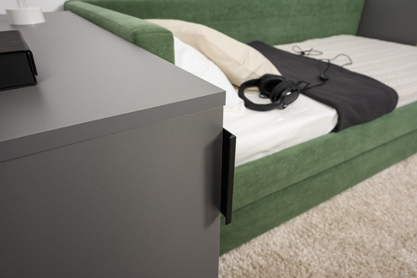 Все вещи ребёнка будут на своём месте. На столе есть крепление для рюкзака или наушников. Наполнение шкафов для одежды можно менять на выбор: полки либо штанги. Петли фасадов оснащены доводчиками.